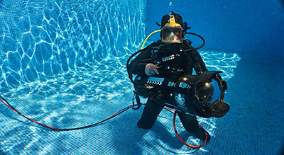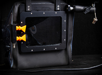 To maintain a clear image, dual air-jets, powered by a standard SCUBA tank, are employed to remove water droplets from the front glass element.